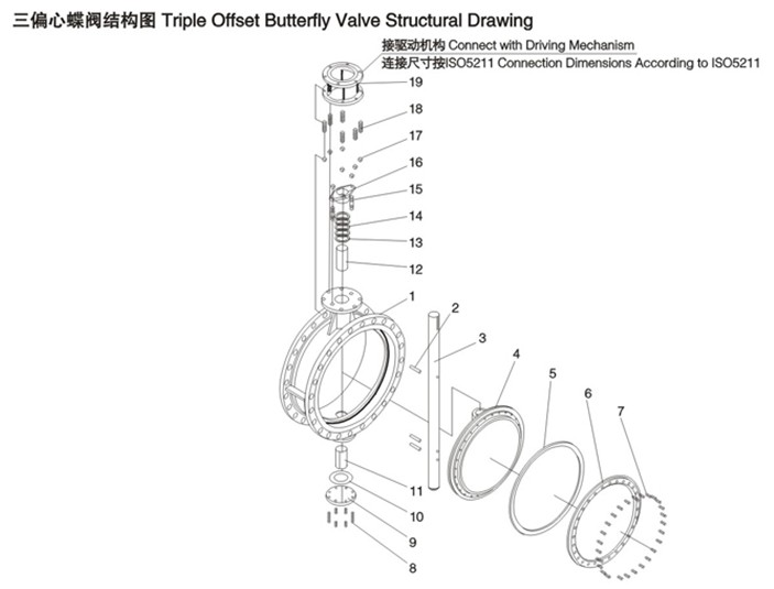 (2)密封墊采用螺旋盤繞不銹鋼/石墨,用于實(shí)現(xiàn)零泄漏。 美標(biāo)凸耳式蝶閥,三偏心金屬密封蝶閥結(jié)構(gòu)圖: ![]() |