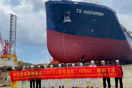 2021年6月18日,中國(guó)船舶集團(tuán)旗下黃埔文沖公司為德翔海運(yùn)建造的2700TEU集裝箱船2#船H5682在水平船臺(tái)順利下水,即將開始碼頭階段的施工作業(yè)。