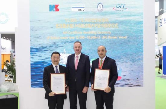 期間,DNV船級社大中國區(qū)總經(jīng)理Norbert Kray、CCS船級社副總裁孫峰分別向滬東中華造船頒發(fā)12000立方米~18600立方米系列無壓載水型LNG加注船AIP證書。