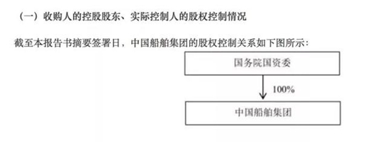收購報(bào)告書顯示,中國船舶集團(tuán)系國有獨(dú)資公司,由國務(wù)院國資委代表國務(wù)院履行出資人職責(zé),國務(wù)院國資委為中國船舶集團(tuán)唯一出資人和實(shí)際控制人。中國船舶集團(tuán)于2019年11月8日設(shè)立,為中船工業(yè)集團(tuán)和中船重工集團(tuán)實(shí)施聯(lián)合重組而新設(shè),具備國家授權(quán)投資機(jī)構(gòu)資格。