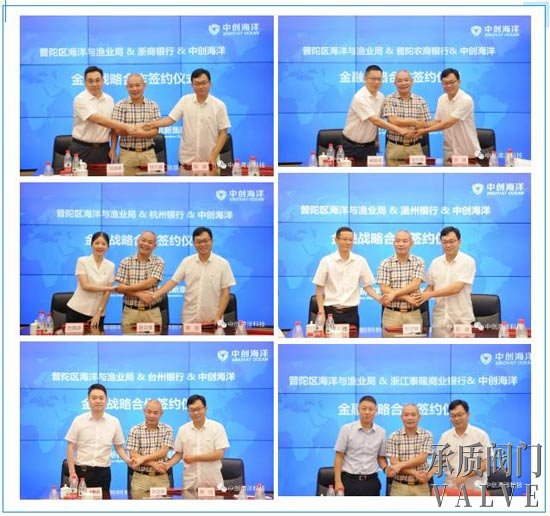 六家金融機構(gòu)代表,在舟山市普陀區(qū)海洋與漁業(yè)局黨委副書記張立德見證下,與中創(chuàng)海洋科技股份有限公司等三方分別簽署了《關于支持國家新材料漁船產(chǎn)業(yè)發(fā)展的金融戰(zhàn)略合作協(xié)議》。