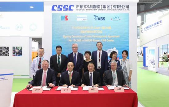 期間,滬東中華造船總經(jīng)理陳軍、ABS美國船級社東半球總裁Eric Kleess、DNV船級社大中國區(qū)總經(jīng)理Norbert Kray和GTT中國區(qū)總經(jīng)理Adnan Ezzarhouni共同簽署17.4萬方NO.96 Super+型LNG船聯(lián)合開發(fā)協(xié)議。