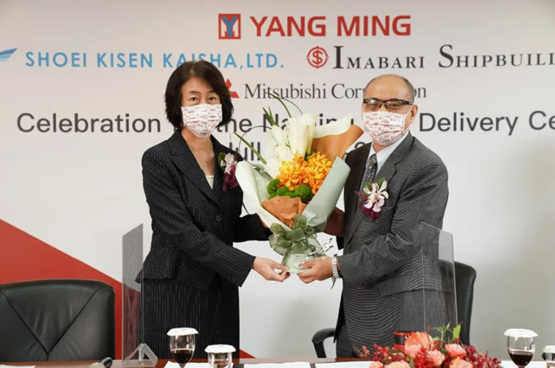 由今治造船為陽明海運量身打造的11,000TEU級集裝箱船“帆明”輪(YM Travel)于今日在今治造船廣島船廠舉辦新船命名暨交船典禮儀式,典禮由今治造船主持,透過線上視訊方式連線陽明海運臺北辦公室,同時邀請永豐金控董事長陳思寬女士擔任「帆明輪」之命名人,為新船獻上一帆風順、班班滿載的圓滿祝福。