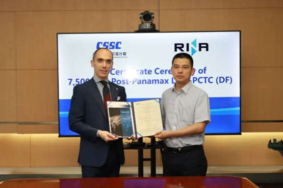 7月20日意大利船級(jí)社為中國船舶上海船舶研究設(shè)計(jì)院(SDARI)頒發(fā)了7500車雙燃料PCTC的AIP證書。